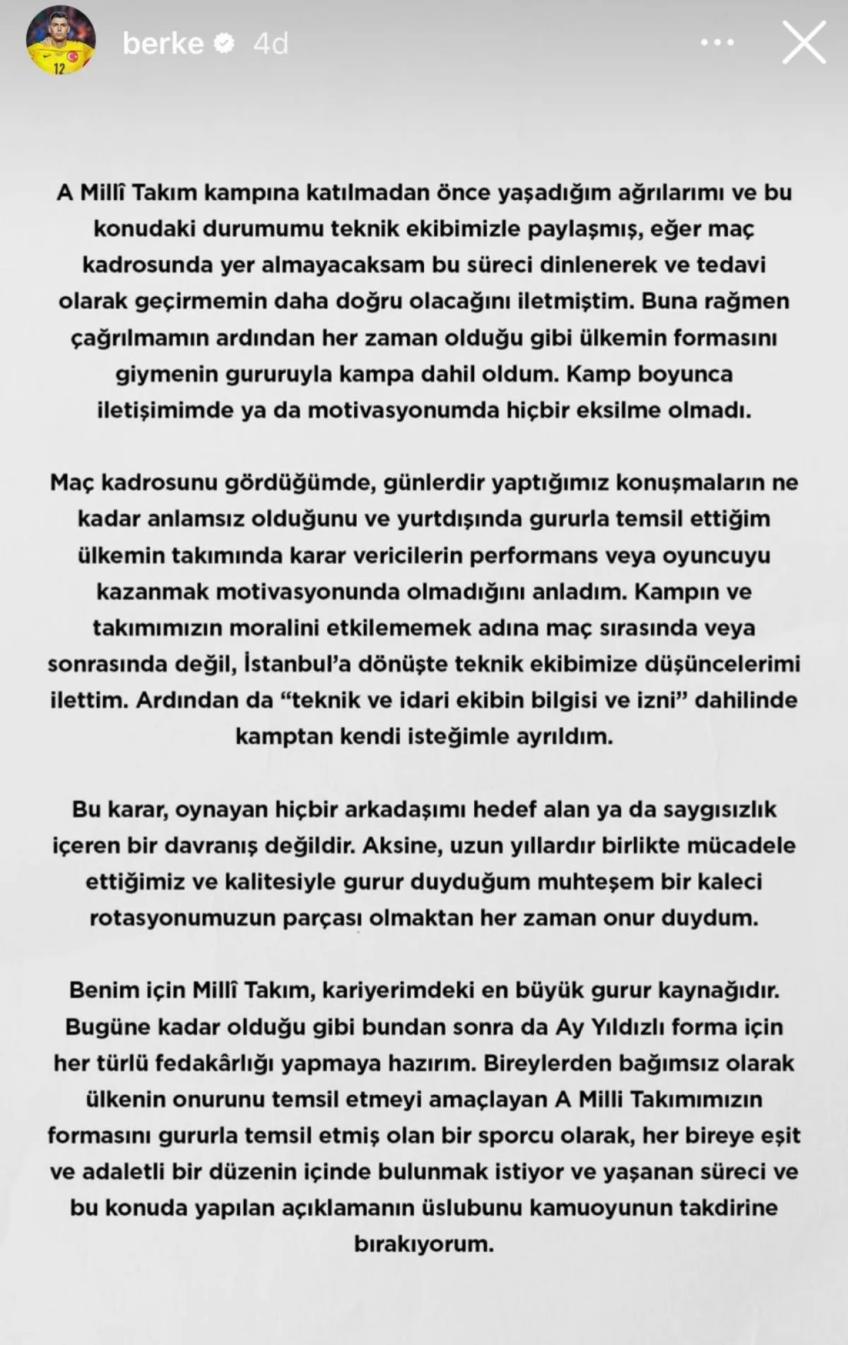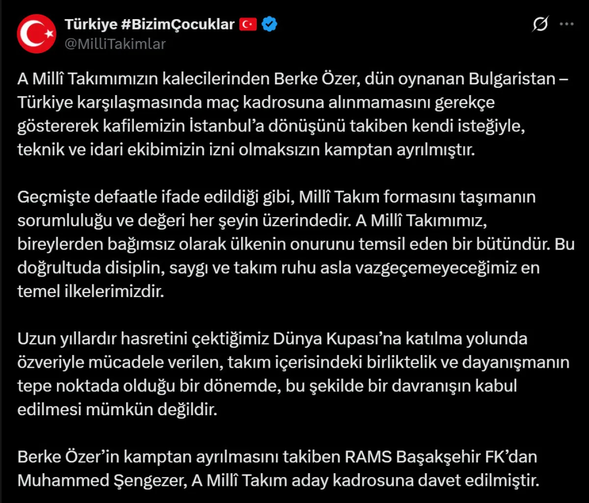 Sosyal medya hesabından açıklama yapan Özer, kamp öncesinde yaşadığı ağrıları teknik ekiple paylaştığını belirterek, şu ifadeleri kullandı: “Kampa çağrıldığımda her zamanki gibi ülkem için gururla geldim. Ancak maç kadrosunda yer almayınca, yaşadığım sakatlık nedeniyle dinlenmemin daha doğru olacağını düşündüm. Dönüşte teknik ekibin bilgisi dahilinde kamptan ayrıldım.” Milli kaleci, açıklamasında kimseye saygısızlık etmediğini vurgularken, “A Milli Takım benim için her zaman gurur kaynağıdır” sözleriyle sürece dair üzüntüsünü dile getirdi.