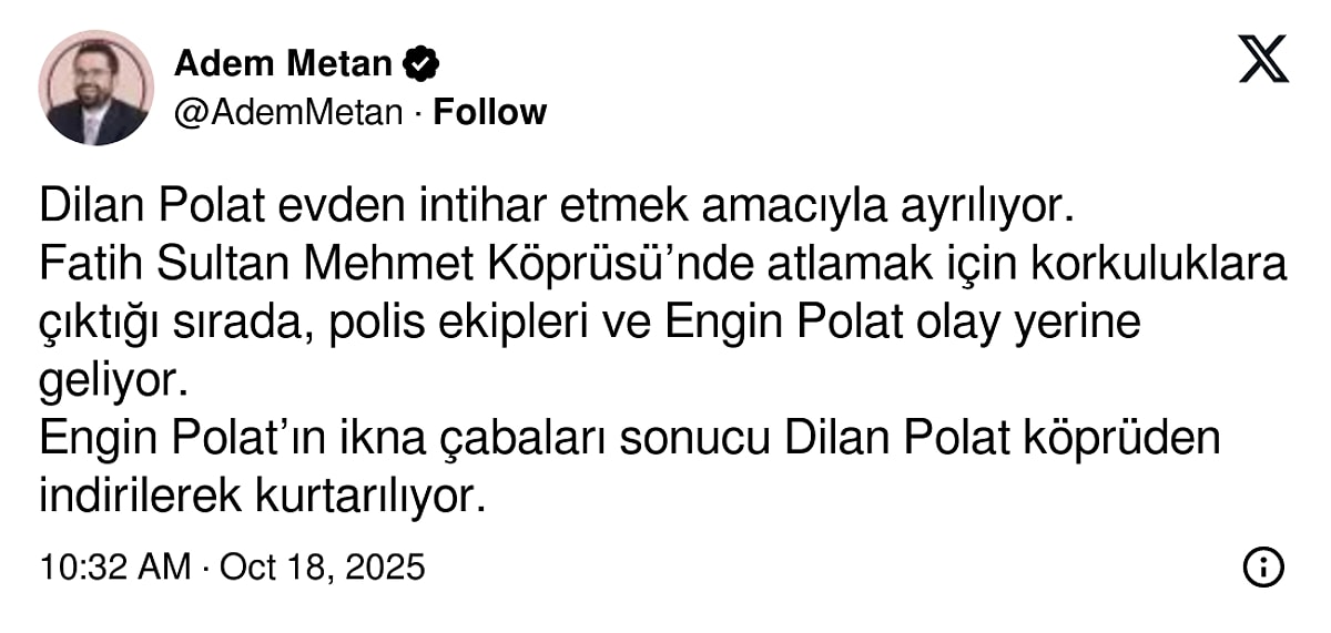 Gazeteci Adem Metan’ın iddiasına göre, Dilan Polat bu sabah evinden intihar etme amacıyla ayrıldı. Polat’ın, Fatih Sultan Mehmet Köprüsü’ne giderek korkuluklara çıktığı, olay yerine gelen polis ekipleri ve eşi Engin Polat tarafından ikna edilerek köprüden indirildiği öğrenildi.