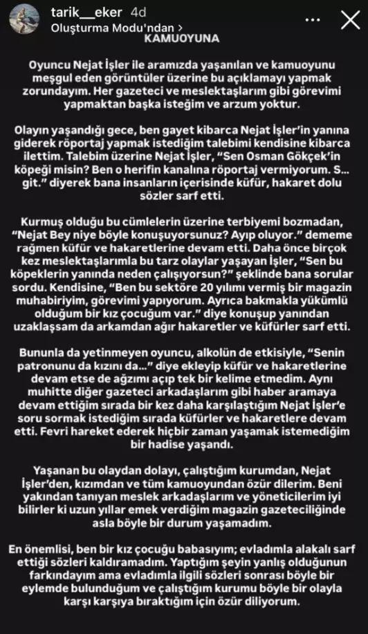 Olay sonrası açıklama yapan Tarık Eker, Nejat İşler’in hem kendisine hem de kızına hakaret ettiğini öne sürdü. Sosyal medya hesabından paylaşım yapan Eker, şu ifadeleri kullandı: